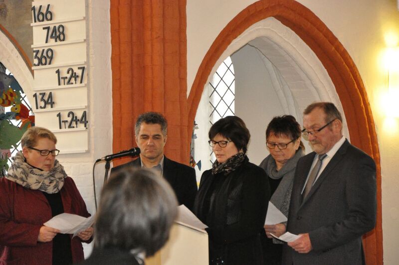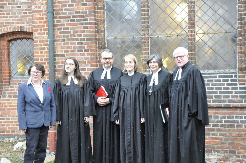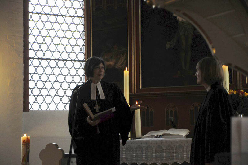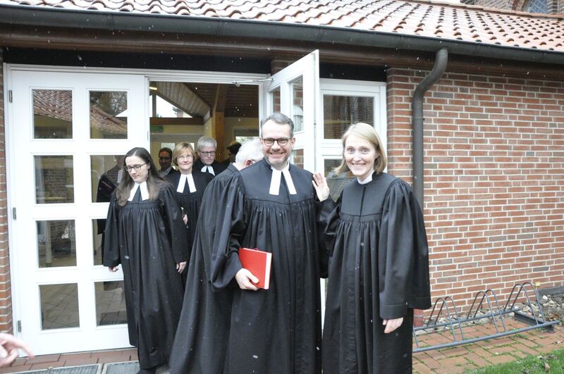 Bei der Ordination, der feierlichen Segnung in das Amt der Pastorin, wurde die Landessuperintendentin unterstützt von Pastor Bernd Niss, bei dem Kerstin Wackerbarth ihr Gemeindepraktikum absolviert hatte, Christiane Preising, ihrer Studienkollegin aus Marburger Zeiten und Heide Husmann, der langjährigen Vorsitzenden des Kirchenvorstandes. Superintendent Klaus Priesmeier verlas die Urkunde der Landeskirche, die mit der offiziellen Feststellung endet: ‚Sie führt die Amtsbezeichnung „Pastorin“‘. Seine neue Kollegin begrüßte er sehr herzlich: Woran mögen Sie sich wohl erinnern an diesem Tag? fragte er. Und verpackte seine Antwort in einen Segenswunsch: „Es hat heute geschneit und die Erde leuchtet.“ Er wünsche ihr diese Freude, die leuchtet, sagte der Superintendent mit Bezug auf die Bibelstelle „Die Freude am Herrn ist eure Stärke“(Neh 8,10).
