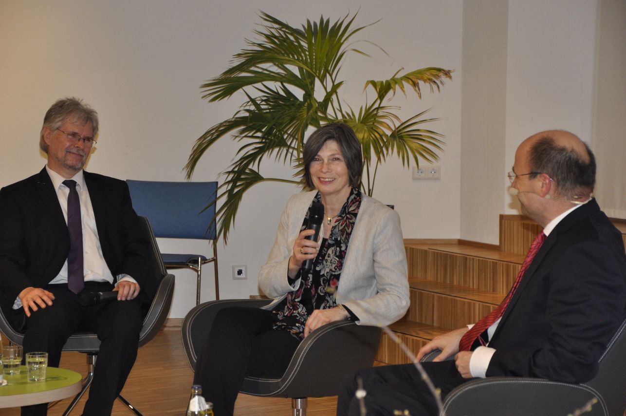 Den ökumenischen Gottesdienst hatten die drei Kirchenoberen gemeinsam mit Vielen in der Hauskapelle gefeiert. Im fast voll besetzten Vortragssaal hielten sich evangelische (ca. 40%) und katholische (ca. 60%) Zuhörer beinahe die Waage, wie Moderator Dr. Michael Reitemeyer zu Beginn der Podiumsdiskussion per Handzeichen feststellen konnte. In die Diskussion startete er mit der eher ungewöhnlichen Frage nach der größten Enttäuschung im Reformationsgedenkjahr. Von einer solchen konnte indes niemand sprechen. Es habe bei ihr die Sorge gegeben, so Dr. Birgit Klostermeier, dass sich nach zehn Jahren vorbereitender Lutherdekade durch die EKD bereits vor dem Beginn des Jahres 2017 Erschöpfung in den Gemeinden und Einrichtungen breitmachen könne. Die Sorge sei ihr jedoch vollständig genommen worden. Weihbischof Wübbe wollte als Enttäuschung höchstens die Erfahrung nennen, besondere Gottesdienste oder andere Erlebnisse verpasst zu haben.
