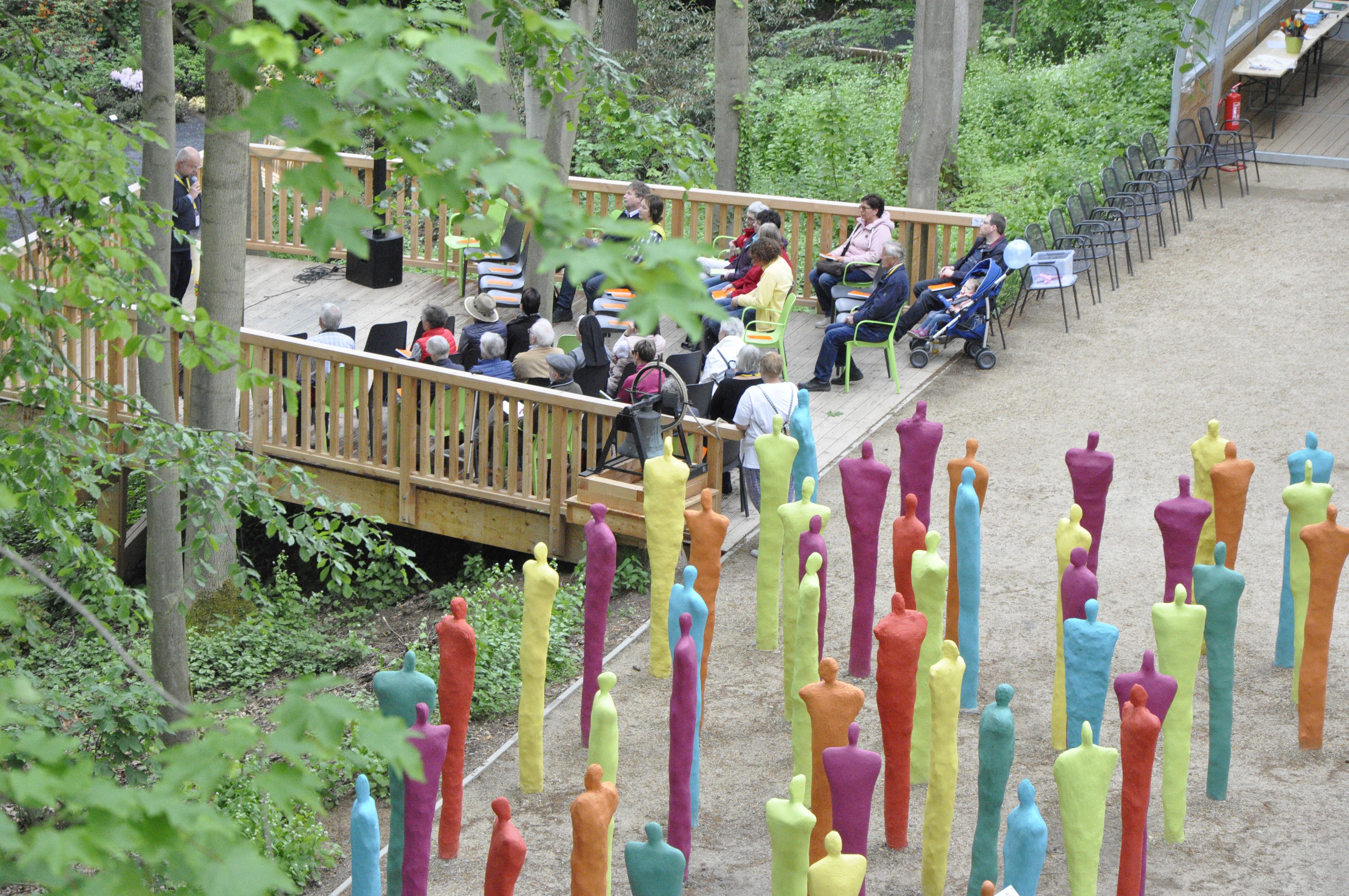 Auf der Landesgartenschau 2018 in Bad Iburg hat Kirche einen besonders schönen Ort gefunden. Die Terrasse der Waldkirche ragt über ein kleines Tal und liegt zugleich wie ein Nest eingebettet zwischen hohen Bäumen. Vom Baumwipfelpfad aus, dessen Zugang gleich neben der Waldkirche liegt, hat man einen Blick von oben auf die bunten Figuren, die hellgrünen Stühle und das farbige Kreuz, das zugleich das Logo der LAGA-Kirche bildet.