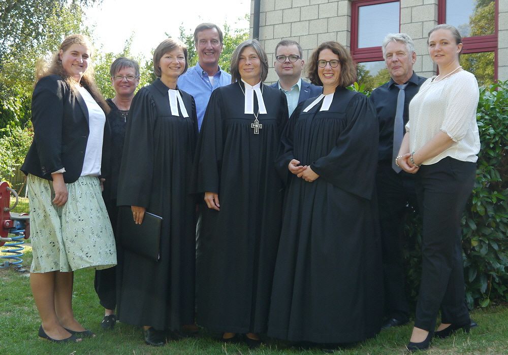 BU: Der Jakobus-Kirchenvorstand mit Landessuperintendentin (v.l.): Nadine Berndt, Monika Gehnen, Pastorin Iveta Thamm, Frank Waniek, Landessuperintendentin Dr. Birgit Klostermeier, Björn Dehnen, Pastorin Kristin Winkelmann, Axel Denker und Stephanie Schnauber.