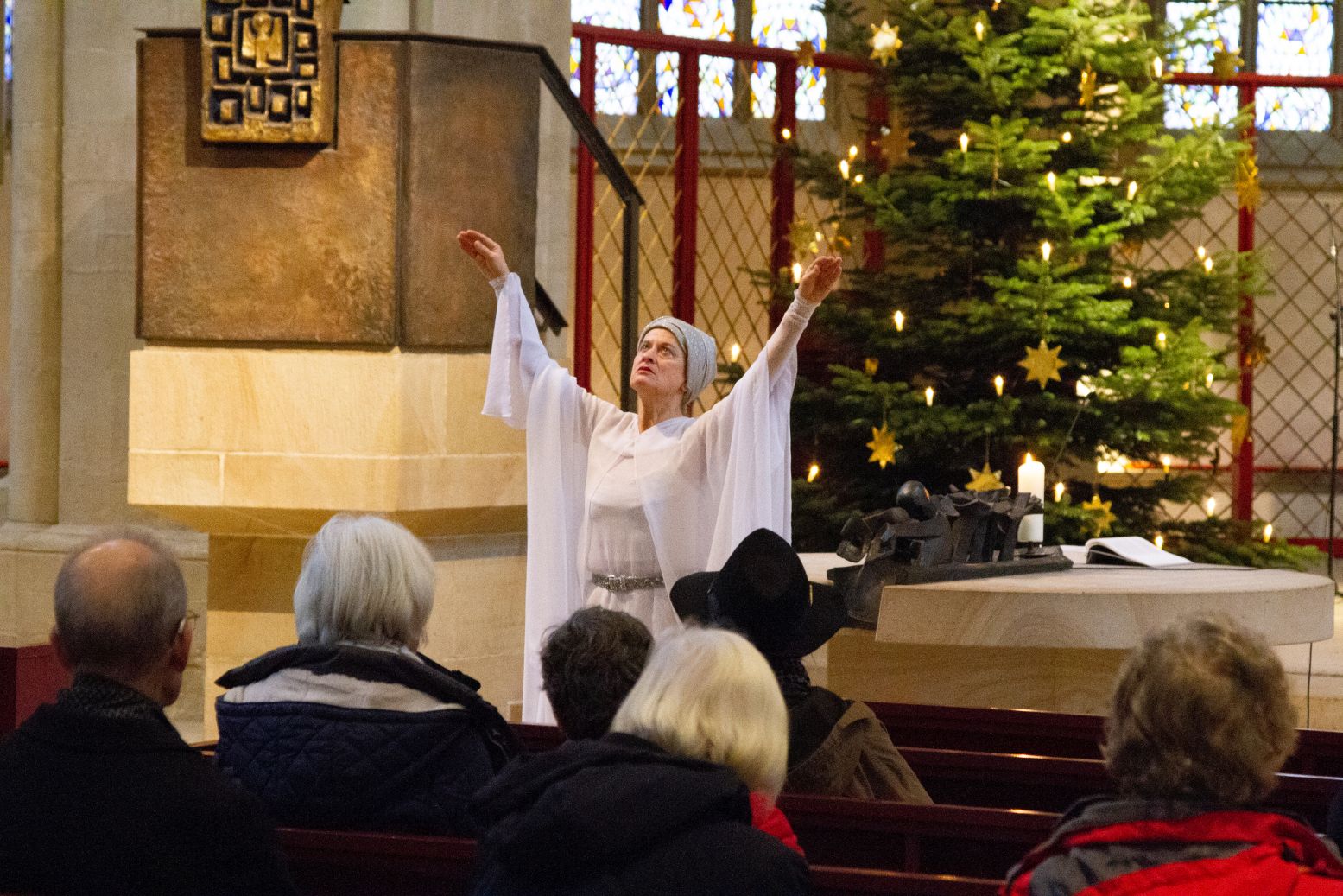 „Manchmal muss auch eine Predigt unterbrochen werden…“ Mit diesen Worten verließ Landessuperintendentin Birgit Klostermeier die Kanzel in der St.Marien-Kirche und gab den Raum vor dem Altar frei für einen Engel. Ulrike Wallis (Hannover) füllte diesen Raum mit ihren Bewegungen, ihrer Stimme und nachvollziehbar mit der Vorstellung vom Menschen, der zwischen Licht und Finsternis gestellt ist. Aus dem Altarraum führte der Tanz in den Kirchenraum hinein. An dieser Stelle setzte die Regionalbischöfin ihre Predigt fort. „ Ganz unten angekommen – Gott auf dieser Erde“.Unvorstellbar, so, wie es auch für die Weisen aus dem Morgenland, die Wissenschaftler und Gelehrten, gewesen sein muss. Dem Stern folgend suchen sie den neuen König und finden mit dem Kind in der Krippe, was sie nicht erwartet haben. „Wie oft sehen wir ein Licht und sehen es doch nicht, hören die Stimme und hören doch nicht hin“, so Birgit Klostermeier. Für das Jahr 2019 und die „Zeit für Freiräume“, wünscht sie der Gemeinde den Blick für den hellen Streifen Licht, der in den Alltag scheint und ihn unterbricht. Man müsse innehalten, um das Licht zu sehen und den Raum zu spüren, in den Gott uns in Freiheit gestellt hat. „Damit ich nicht vergesse, worum es eigentlich im Leben geht“, so die Regionalbischöfin, „und dann kann es sein – wie bei den Weisen – dass ich den Weg anders fortsetze als ich eigentlich vorgehabt habe.“ Ein Engel, Musik vom Flügel, einfühlsam gespielt von Fabio Schnug, Gedichte statt Epistellesung und eine unterbrochene Predigt: Der Gottesdienst mit Flügel(n) bot viele Ansätze, Anderes und anders zu sehen und zu hören.