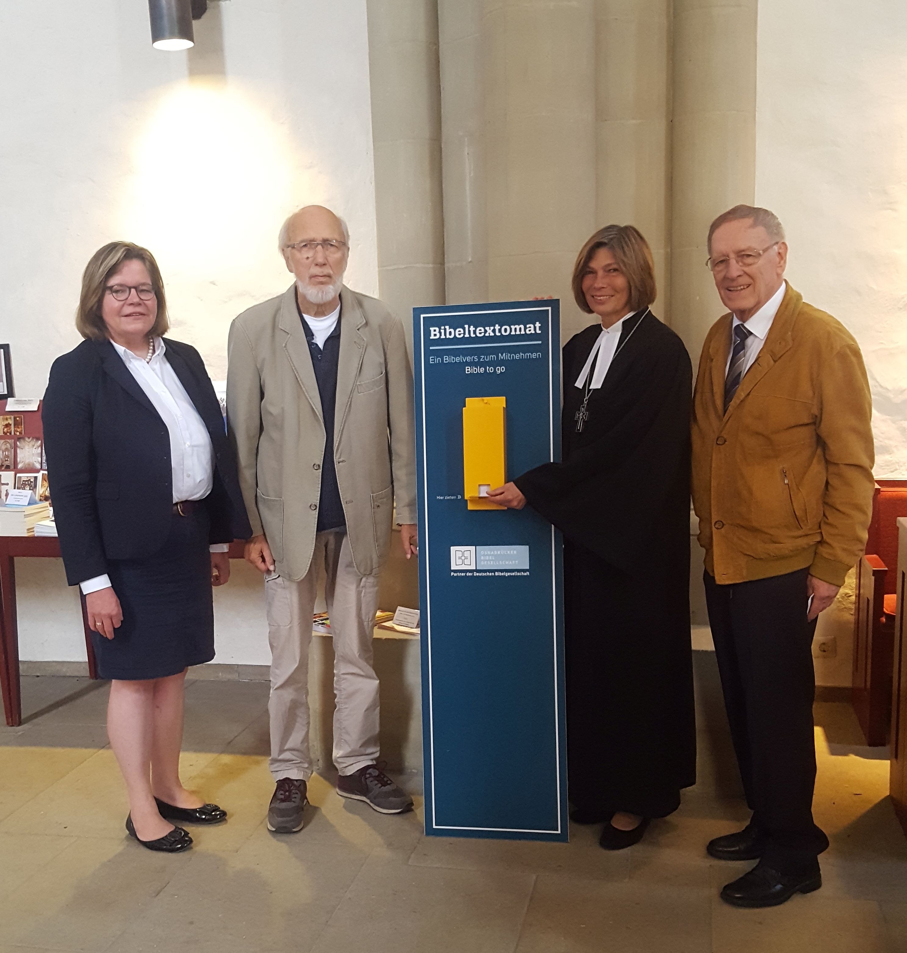 Unaufdringlich und handlich: Die Bibelverse im Scheckkartenformat aus dem Bibeltextomaten nehmen Besucherinnen und Besucher der beiden großen Innenstadtkirchen offenbar gern mit. Seit knapp drei Monaten stehen in St. Marien und St. Katharinen die blauen Aufsteller der Deutschen Bibelgesellschaft mit dem Ausgabespalt für den „Bibelvers to go“. Die kleinen Impulsgeber in deutscher und englischer Sprache erfreuen sich großer Beliebtheit. Vielleicht machen sie auch neugierig, tiefer in die Bibel einzusteigen. Das zumindest ist die Hoffnung der Osnabrücker Bibelgesellschaft, die die Textomaten hat aufstellen lassen. Über 3000 Kärtchen haben bereits den Weg in Hand- und andere Taschen gefunden. Darüber freut sich auch Landessuperintendentin Dr. Birgit Klostermeier zusammen mit den Vertretern der Osnabrücker Bibelgesellschaft Werner Wasmuth und Klaus Haug sowie Friederike Dauer vom Kirchenvorstand der St. Mariengemeinde.