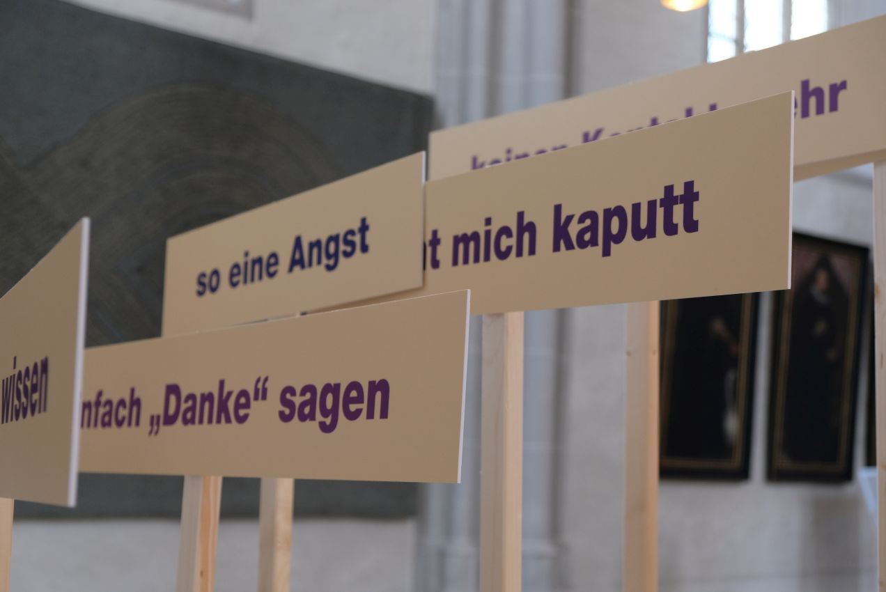 Mit der Feier des Jubiläumsgottesdienstes wurde die Kunstausstellung „Momente“ eröffnet. Künstlerinnen und Künstler setzen sich auf ihre Weise mit der Begegnung am Seelsorgetelefon auseinander. Die Ausstellung ist noch bis einschließlich 20. September in der Kirche zu sehen.