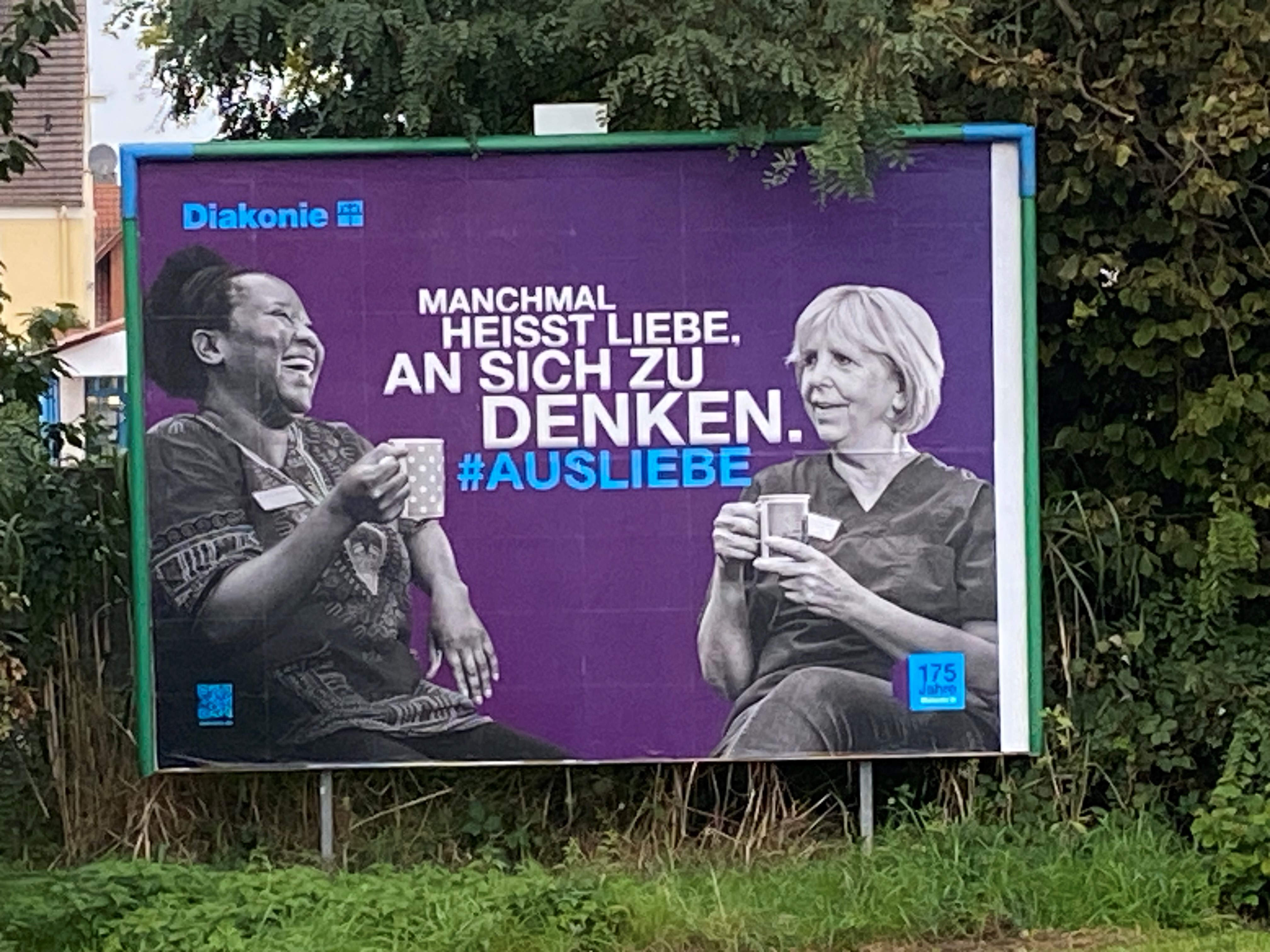 „Manchmal heißt Liebe, an sich zu denken.“ Mir fiel die Aufschrift des Plakates in die Augen und ich stutzte erst einmal. Normalerweise ist Liebe doch immer auf andere ausgerichtet, war mein erster Gedanke. Dann erkannte ich das Design der Diakonie und auch den entsprechenden Namenszug in der Ecke. Unter dem Slogan fand sich das Motto #AUSLIEBE: Dieses Plakat gehörte zur Kampagne „175 Jahre Diakonie“, die im zu Ende gehenden Jahr 2023 durchgeführt wurde. Das Motto „aus Liebe“ erinnert an eine Rede, die der Theologe Johann Hinrich Wichern am 22. September 1848 auf dem Kirchentag in Wittenberg gehalten hat. Dort appelliert er an die Kirche, ein Netzwerk der „rettenden Liebe“ zu knüpfen, um Bedürftigen zu helfen. Daraus hat sich die Diakonie bis heute zu einem großen kirchlichen Sozialverband entwickelt, der in vielen unterschiedlichen Bereichen aktiv ist. Die Plakate der Kampagne zeigen viele dieser Bereiche: Menschen, die anderen Gutes tun, die zuhören und Hand anlegen – Nächstenliebe! Auf jenem Plakat aber sind zwei Frauen zu sehen, die sich mit einem Kaffeebecher gegenübersitzen.
