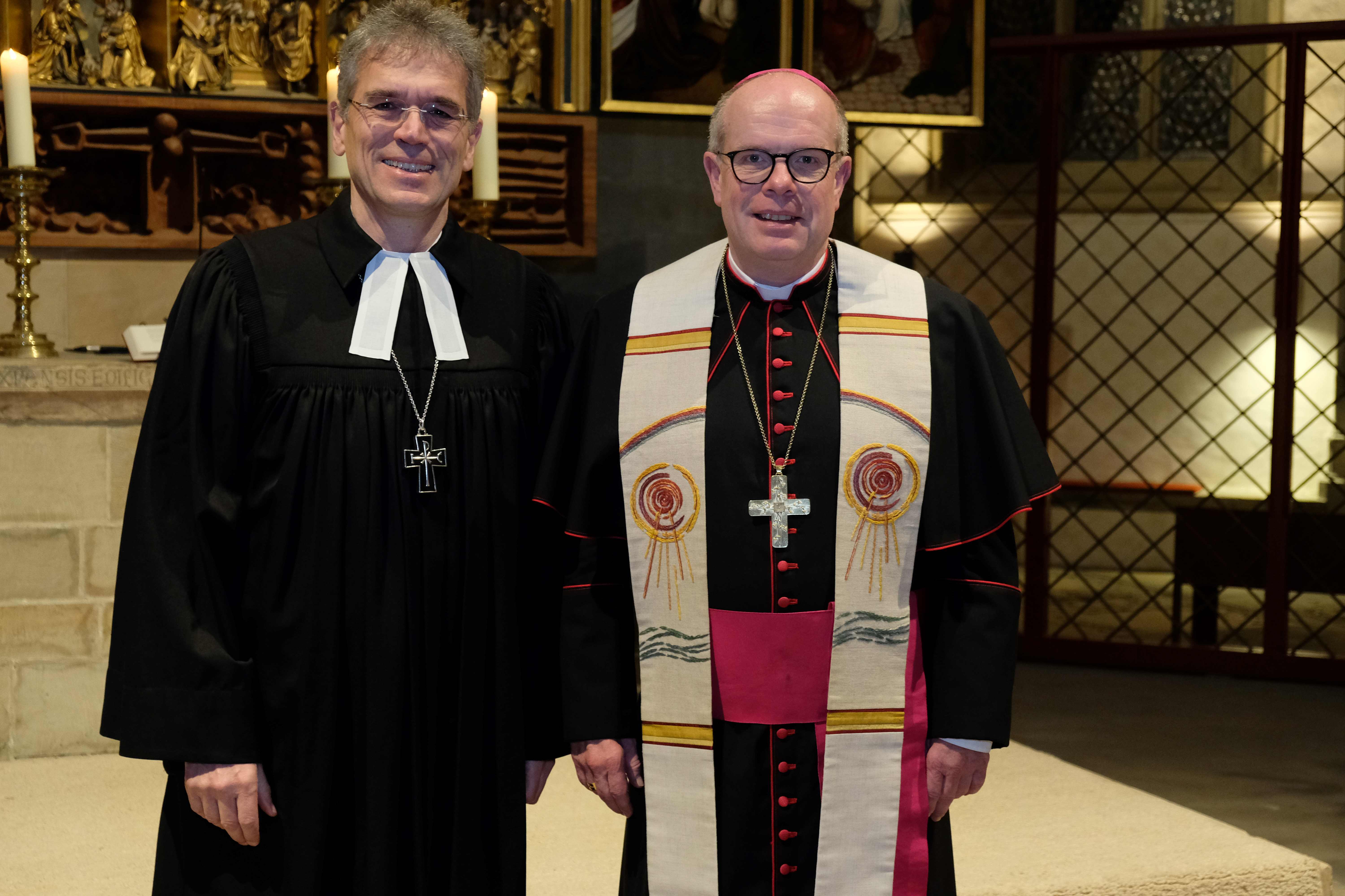 Der Ökumenische Neujahrsgottesdienst zur jeweiligen Jahreslosung, findet seit 24 Jahren im Wechsel im Dom und in St. Marien statt. Dieser Rhythmus war durch Corona unterbrochen worden. „Ich freue mich darüber, Sie alle nach vier Jahren nun auch wieder in St. Marien zu begrüßen. Danke, dass wir in den vergangenen Jahren im Dom zu Gast sein konnten. Der große Gottesdienstraum und die ausgezeichneten Übertragungsmöglichkeiten haben es so möglich gemacht, auch während Corona an dieser schönen Tradition festzuhalten“, wandte sich Regionalbischof Friedrich Selter zu Beginn des Gottesdienstes an die versammelte Gemeinde und direkt an Weihbischof Johannes Wübbe, der die Predigt in Marien hielt.