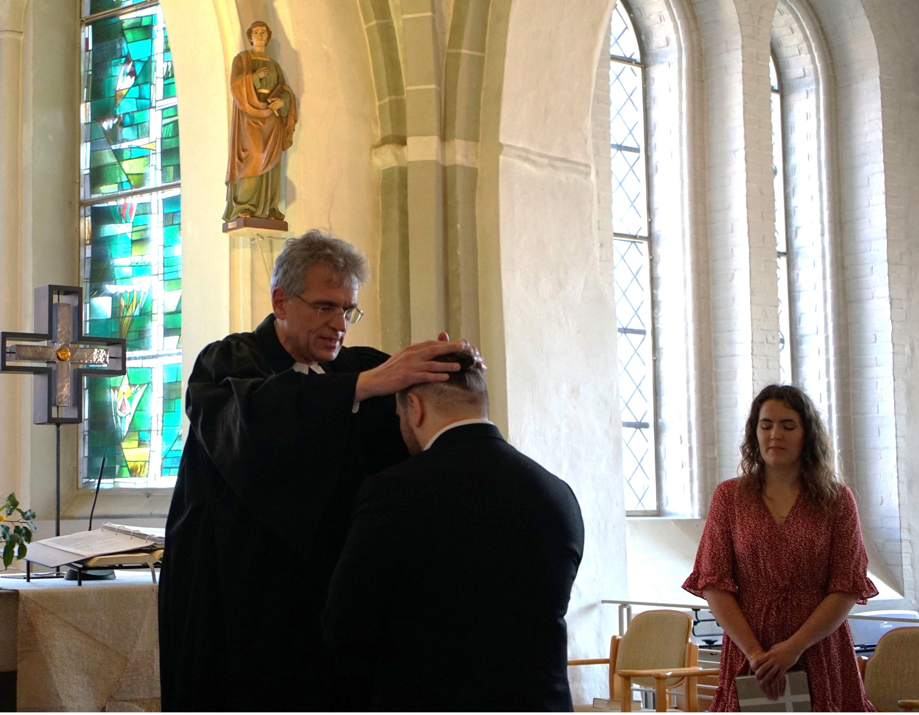 Einsegnungspat*innen sind Diakonin Birgit Blendermann, die seinen beruflichen Weg wesentlich begleitet hat, Laura Wojciechowski, eine langjährige gute Freundin und Emma Uetrecht, eine ehrenamtliche Vertreterin aus dem Kirchenkreis und im Vorstand des Kirchenkreisjugendkonvents.