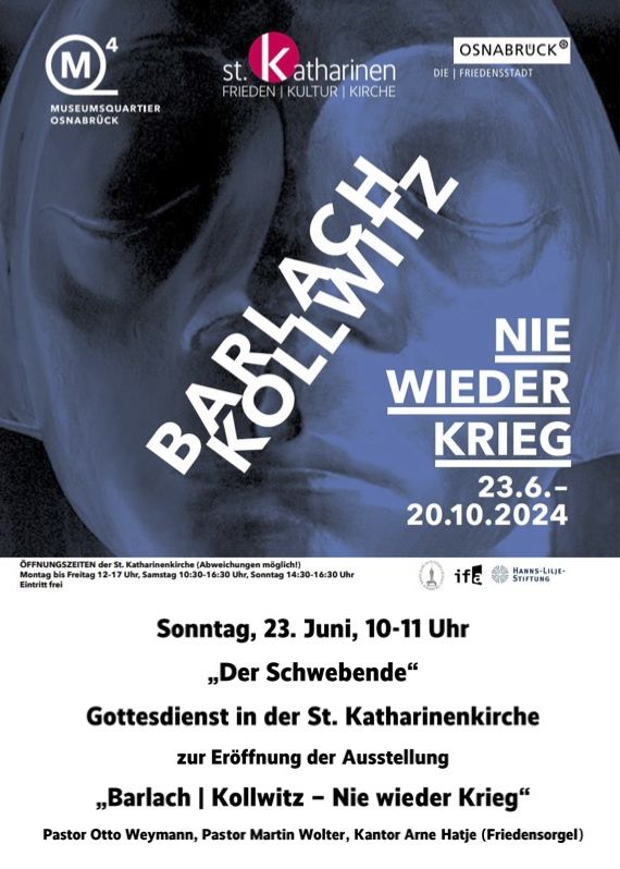 Zur Eröffnung der Ausstellung „Barlach | Kollwitz – Nie wieder Krieg“ lädt die Evangelisch-lutherische St.-Katharinen-Kirchengemeinde Osnabrück am Sonntag, 23. Juni, um 10 Uhr zu einem Gottesdienst in die St.-Katharinen-Kirche, An der Katharinenkirche, 49074 Osnabrück, ein. Unter der Überschrift „Der Schwebende“ gestalten Pastor Otto Weymann, Pastor Martin Wolter und Kirchenkreiskantor Arne Hatje an der Friedensorgel die Feier in der Kirche. Hier sind drei größere Objekte Ernst Barlachs ausgestellt. Um 11.30 Uhr findet die Ausstellungseröffnung im Kulturgeschichtlichen Museum im Museumsquartier Osnabrück statt.