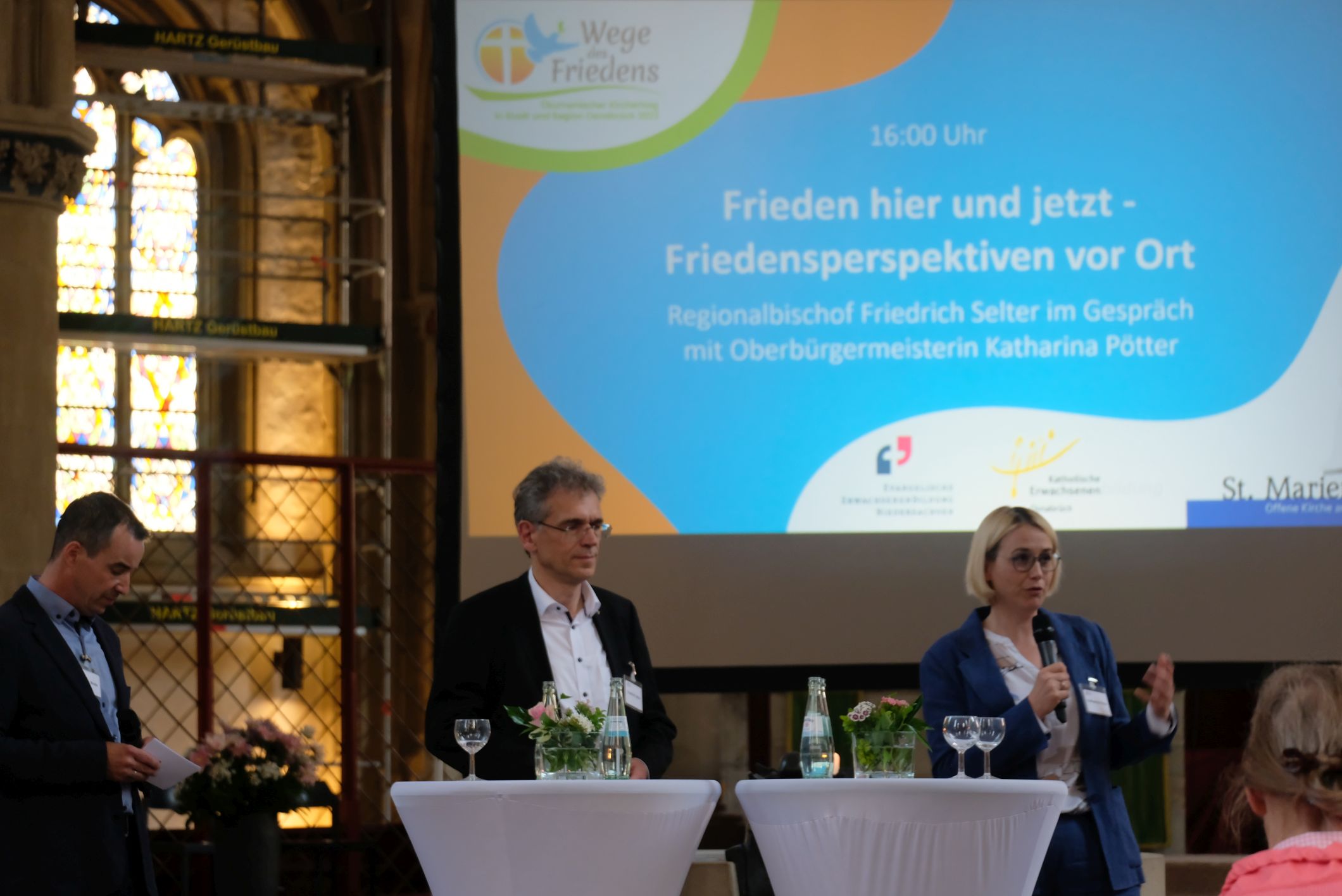 Gegründet als geistlicher Ort sei sie dem gottesdienstlichen Leben und der Spiritualität geweiht. Aber St. Marien sei nie eine nur auf sich selbst bezogene Kirche gewesen, so Friedrich Selter. Die Gemeinde habe sich von Anbeginn an für ein gutes Leben in Osnabrück eingesetzt. Dem Schalom, dem Frieden im engeren Sinne, habe St. Marien insbesondere während der Verhandlungen zum Westfälischen Frieden gedient. Seit 1643 war sie geheimer Verhandlungsort der Schweden und Dänen, die sich hier zu vertraulichen Gesprächen im geschützten Raum trafen. Als am 25. Oktober 1648 im Friedenssaal des Rathauses der Westfälische Frieden verkündet wurde, spielten Bläser auf dem Turm der Kirche Choräle in alle Himmelsrichtungen, erinnerte Friedrich Selter.