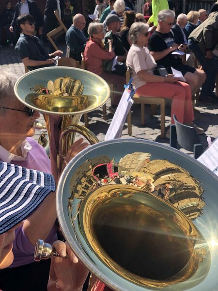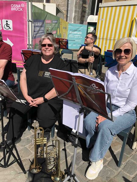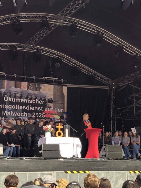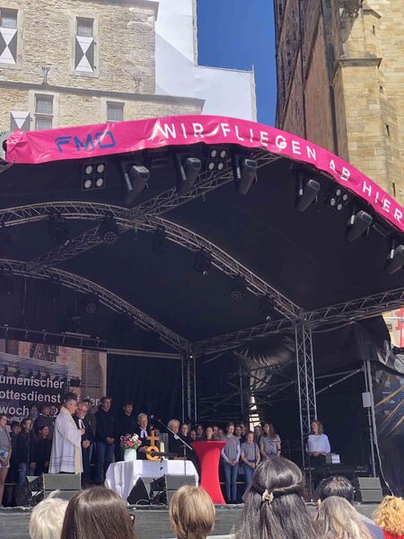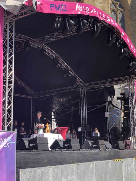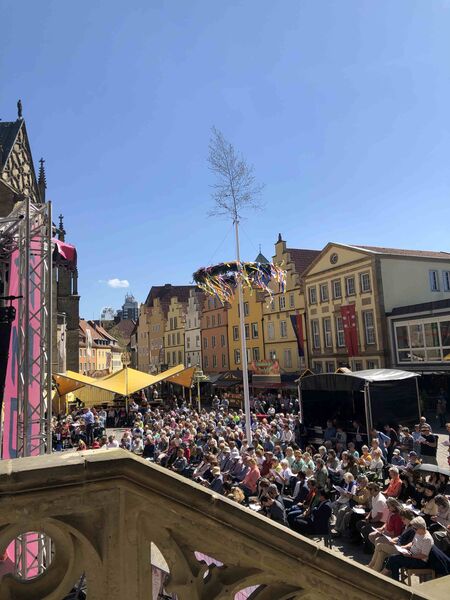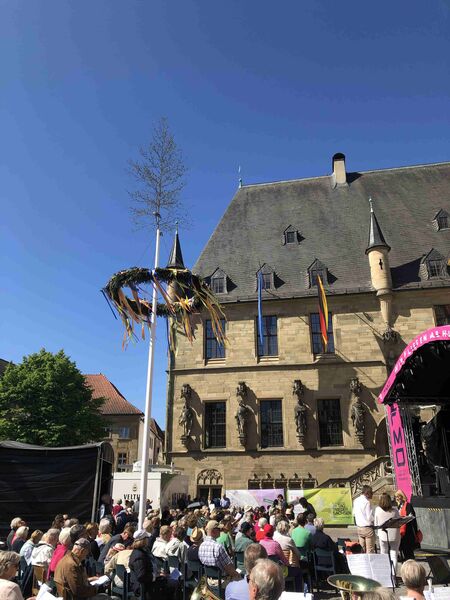 Für einen Gedenk- und Friedensgottesdienst zu 80 Jahre Kriegsende kann es in Osnabrück keinen besseren Ort geben als den zwischen dem Rathaus des Westfälischen Friedens und der St. Marienkirche. Das Bild auf dem Platz ähnelte dem des Ökumenischen Kirchentages im Frühjahr 2023 zum Gedenken an 375 Jahre Westfälischer Frieden und des Landesposaunenfestes "Lauter Frieden" im Herbst desselben Jahres. Die Sonne spiegelte die Fassaden des schönsten Platzes von Osnabrück in den Posaunen und Trompeten, die Stühle reichten nicht und auf der Maiwochen-Bühne gab es Musik, Worte und Wünsche zum Frieden. Nicht nur von den Verterter*innen der Christlichen Kirchen in Osnabrück, die zu diesem Gottesdienst eingeladen hatten, sondern auch von OB Katharina Pötter und den Delegationsleiter*innen der Osnabrücker Partner- und Freundschaftsstädte aus Angers, Çanakkale, Derby, Greifswald, Gwangymeong, Haarlem und Hefei.