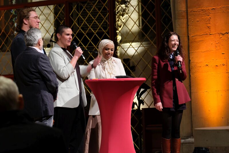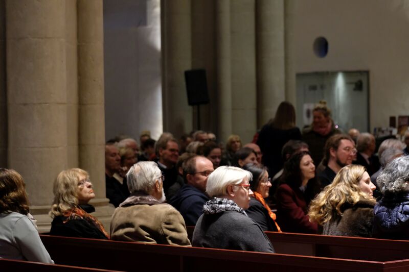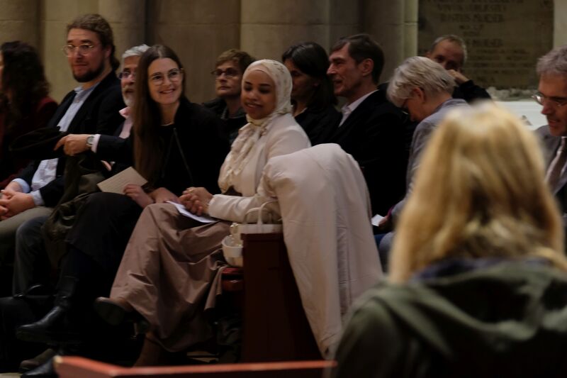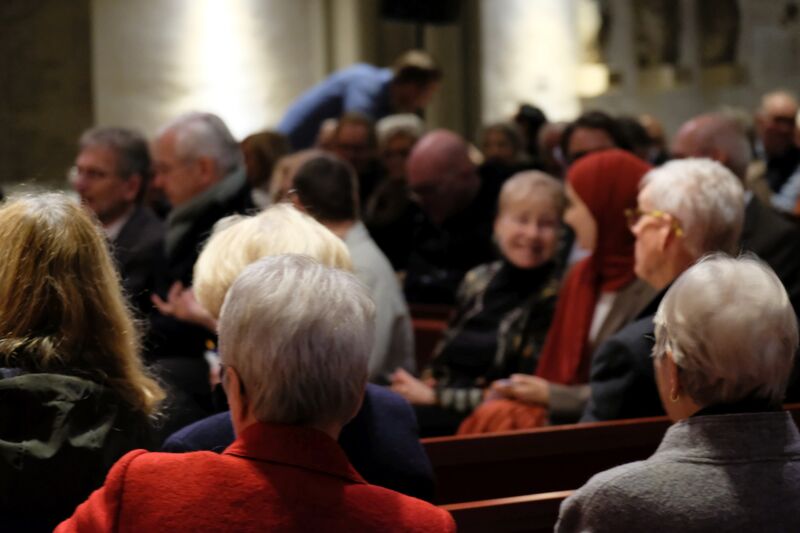 Die Einladung zur Neugier setzte Samira El-Filali, Diversitätsbeauftragte der Stadt Osnabrück, konkret um und ermutigte die Gäste, mit ihrer Sitznachbarin oder ihrem Sitznachbarn ins Gespräch zu kommen: „Was hat mich geprägt?“ Die Kirche summte vor Gesprächen. Ihr Fazit: „Wenn Sie bei solch einer schweren Frage schon so gut ins Gespräch kommen, warum klappt es denn nicht auch in unserer Gesellschaft häufiger mit dem Smalltalk, um Fremdheit zu überwinden?“